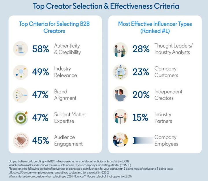 在“信任为先”的营销逻辑中,影响力营销的角色正在发生质变。它不再是通过KOL喊话来快速获取声量的短期策略,而是逐步演变为通过可信第三方建立“权威信任”的长期机制。报告显示,73%的B2B营销人员认为,与行业影响者和内容创作者的合作将在未来一年对品牌建设产生关键作用。这种合作不再局限于品牌曝光,而是在于通过行业人物的专业背书,赋予品牌“值得被相信”的社会印象。总的来说,报告中的“影响力营销”是指品牌通过与行业专家、内容创作者等可信的第三方合作,借助其专业影响力和受众信任,为品牌在目标市场中建立权威、加速信任转化的营销策略。