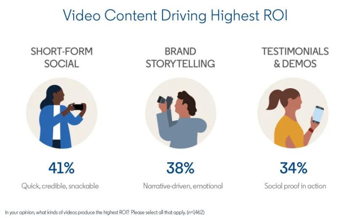 其中,短视频成为B2B营销人员吸引注意力和建立可信度的最佳工具,具备强大的投资回报能力(ROI)。在买家时间和注意力有限的情况下,短视频能够快速传递价值并留下深刻印象。数据充分说明:短视频社交是表现最佳的视频格式,紧随其后的是品牌故事和客户评价。这些视频内容形式不仅能够传递信息,还能激发互动并建立信任,是营销人员在选择视频形式时的最佳方案。